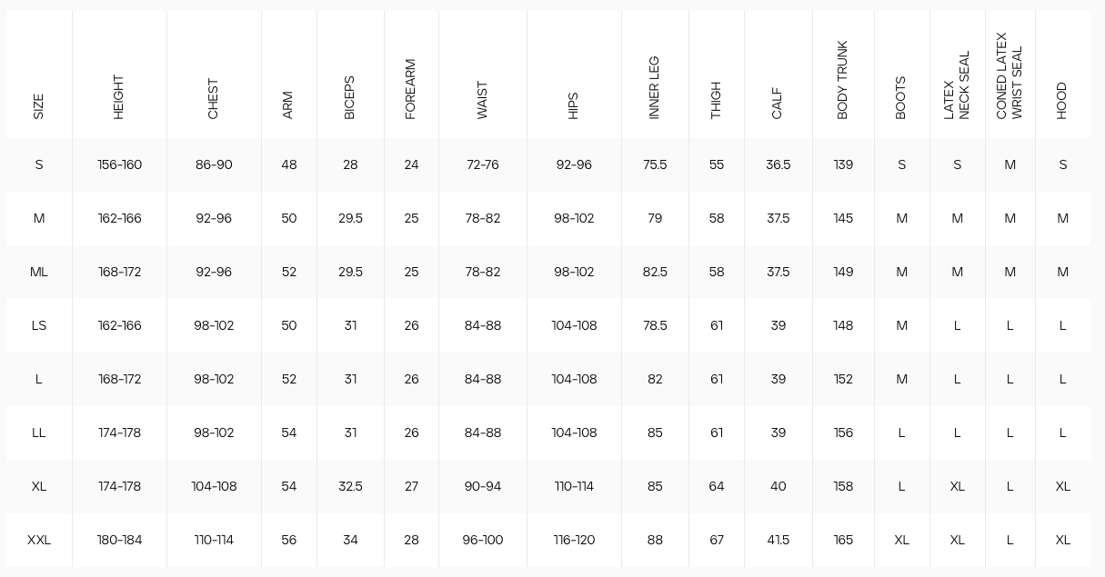 - Features: Laminated cuffs with thumb loops, wide elastic foot stirrups, heating cable/P-valve openings
